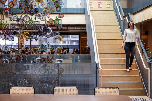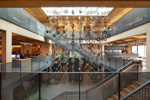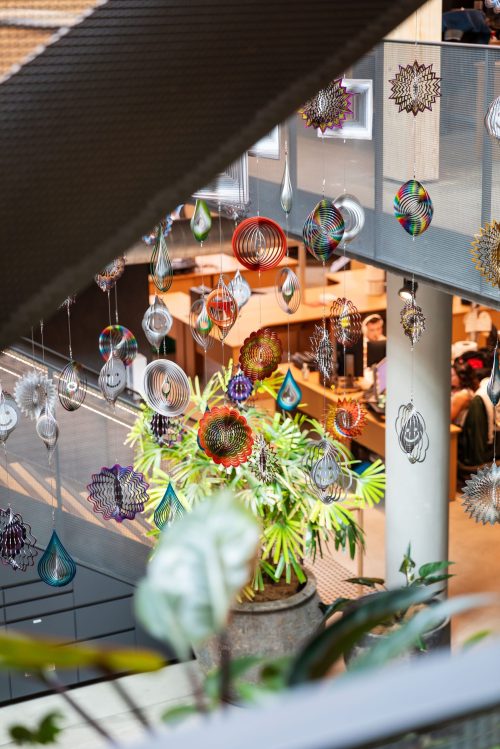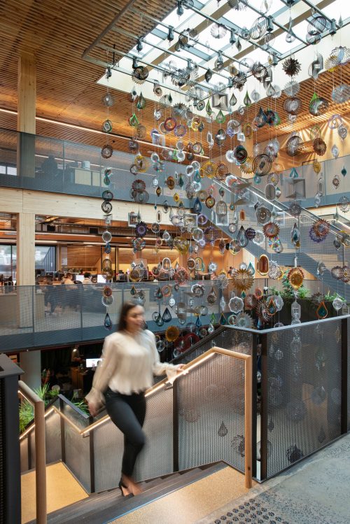 Adding a touch of artistry and culture to the workspace, a mesmerising sculptural installation called “Spinner Forest” by renowned American artist Nick Cave cascades from the skylight in the void. Comprising 480 kinetic spinners, each with its unique form and character, the installation comes together to represent and reflect the vibrant company culture.