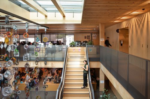 As the stair ascends, the material palette transitions, embracing a tree-house atmosphere on the top floor. Cross-laminated timber columns and pine batten ceilings create a warm and welcoming ambiance, encouraging a sense of comfort and tranquility. This design choice further reinforces the harmonious integration of nature-inspired elements with the industrial heritage of the building.