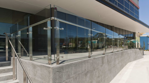 Providing a typically higher strength design, this balustrade has a myriad of alternatives in the finishing and style of the posts and glass connections. The example has a spider style patch fitting off a stainless steel flat bar post. Post options could include mild steel painted or stainless steel flat bar or tube posts.