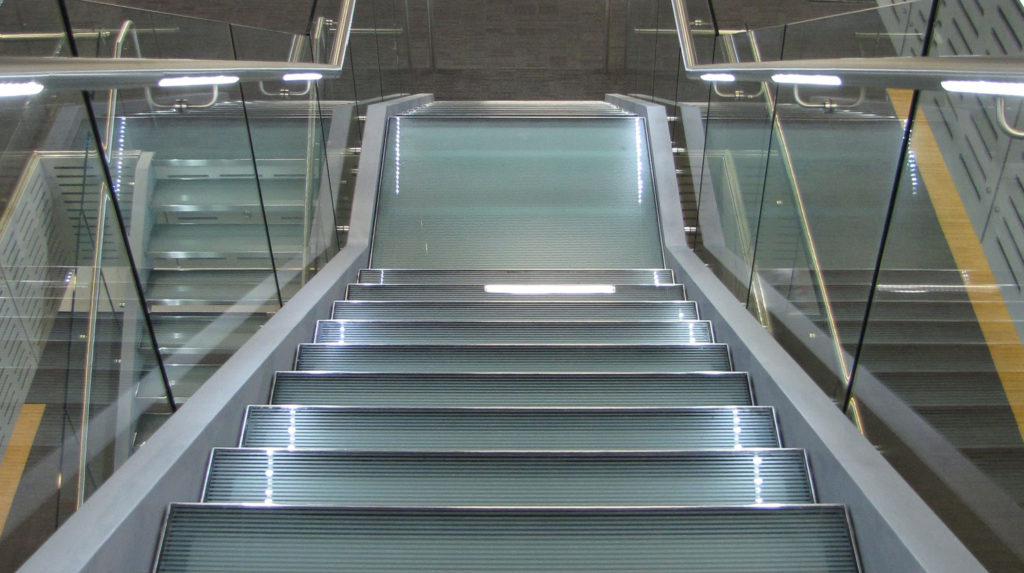 The example here has a flat bar picket and the balustrade panel is fully integrated with the stair. This design typically has the handrail inboard as a completely separate element with the steel picket barrier rising well above the standard minimum of 1000mm to around 1100mm or 1200mm. All mild steel components would be prepared and primed off site with either hand or spray applied top coats being completed after site fabrication
