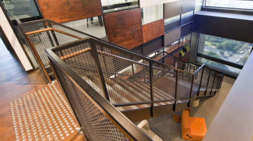 A simple yet effective design, mild or stainless steel weld mesh can be fully welded into the balustrade frame for a cost efficient and more industrial style balustrade design. In this example, all panels were made and pretreated off site with the final site coating being done onsite after fabrication completion.