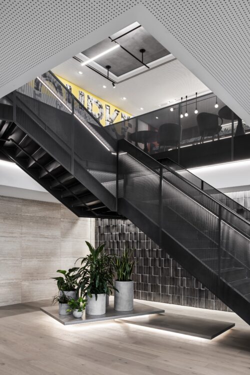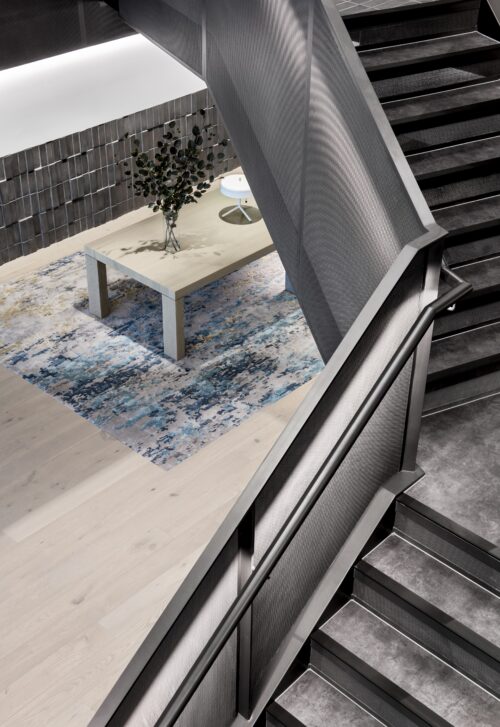 And reflecting the sophisticated materiality is the black mesh balustrade stair. With the superb use of lighting, the stair appears to have a sort of ethereal glow about it, in spite of a distinctly industrial vibe. Exposed soffits and steel mesh are generally associated with a more rugged look, but the finishes of the stair, the lighting and the surrounding finishes have lifted this stair installation to new heights of elegance. Mesh risers provide a touch of class and assist the transparency of the stair.