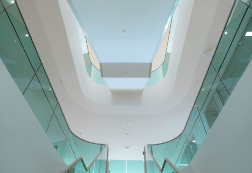 Stair and balustrade design, structural steel stairs, frameless glass balustrades to void and stairs,plasterboard soffit lining to stairs, timber handrails, nosings & tactiles indicators