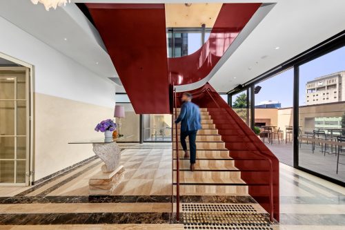 Visually and physically connecting the dinning room and terrace located at level 9, and the sky bar located at level 10 is the curved feature staircase created by Active Metal. The staircase beautifully choreographs the journey for the visitors from the dinning room to the rooftop, which provided with a bird’s eye view of the building’s iconic 400-tonne clock tower, a fresh perspective of panoramic Sydney skyline and the bustling Sydney streets views. The feature staircase are fabricated in a floor-to-floor height of 4260mm, with a curved half circle landing and completed with steel plate balustrade steel handrails painted in maroon.