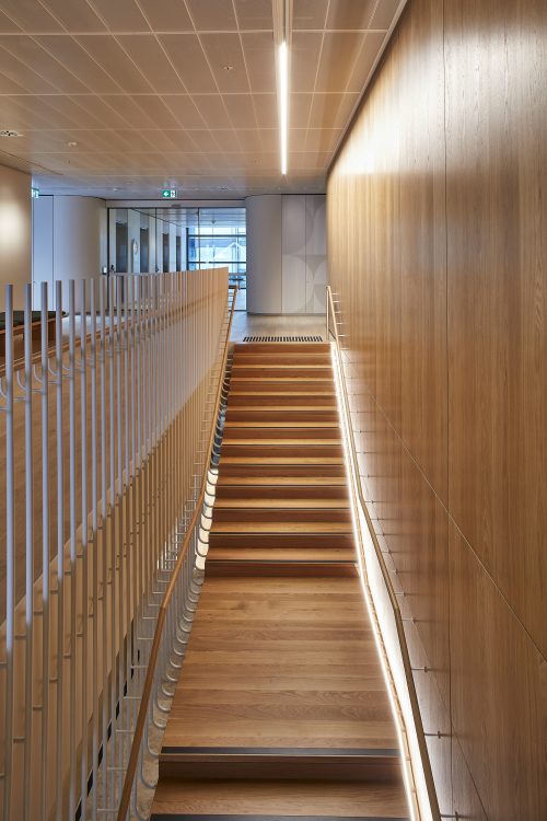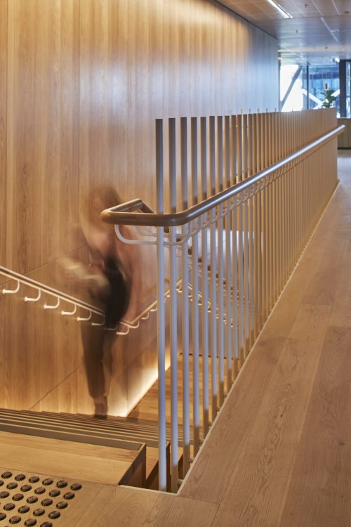 Detailed shop drawing & site surveys, timber clad steel stair, stair rod balustrading, timber handrails, void rod balustrading, stone tread nosing, tactile indicators, void trimmer beams