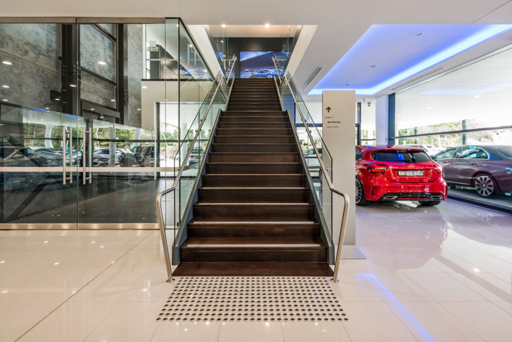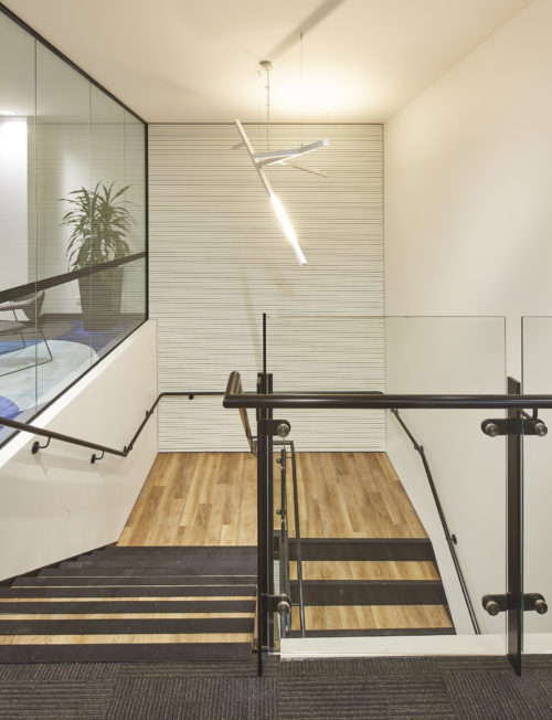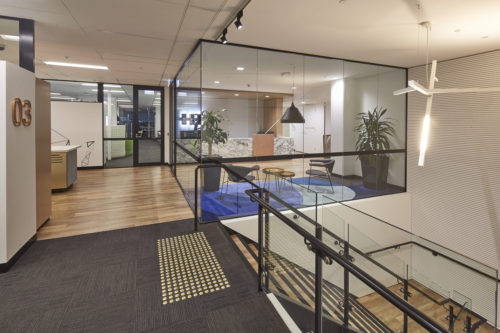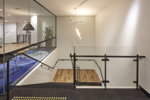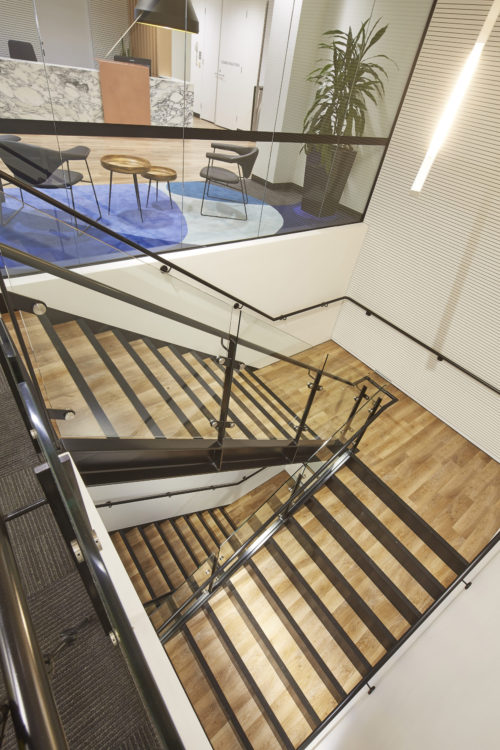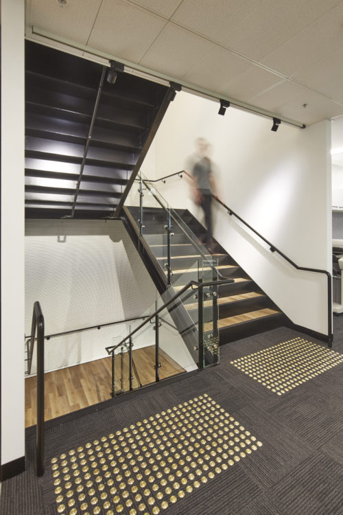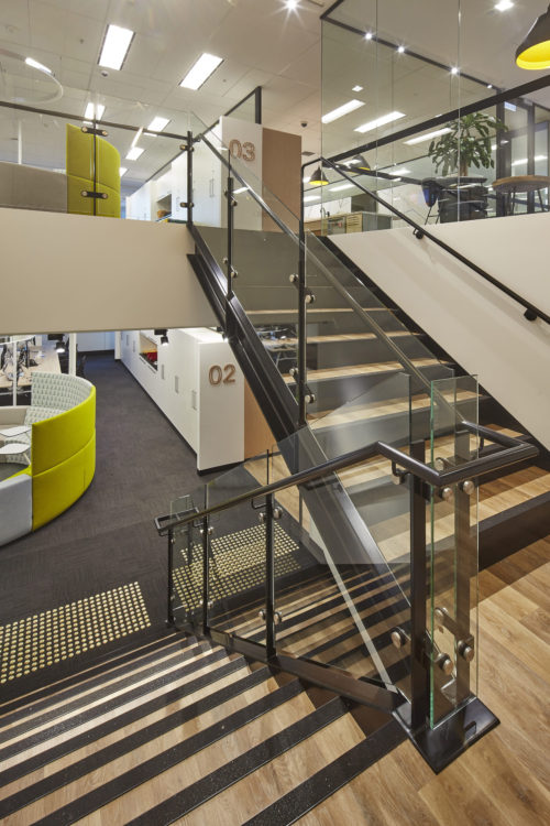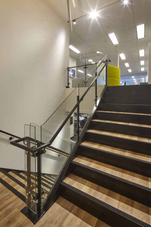 The Active Metal team worked to create the stairs that would service three levels and over 400 staff, with the finished open channel stringer staircase design including painted handrails, timber look vinyl treads and glazed balustrades among many other details.
