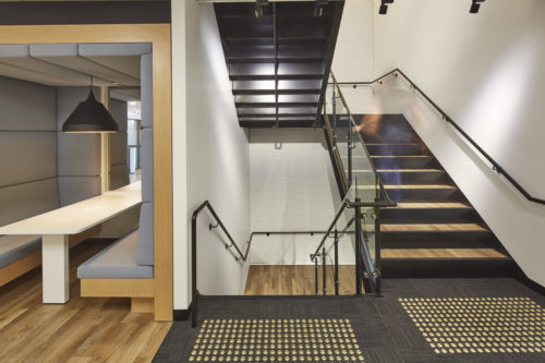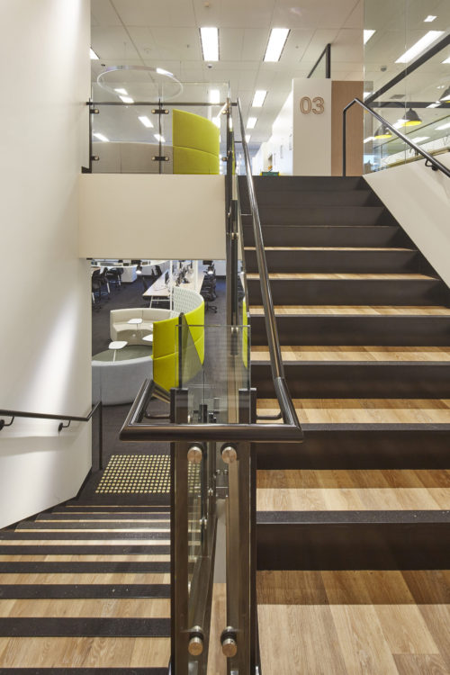 Designed by Davenport Campbell, HSBC Parramatta is the brand’s regional administrative office. Set across four levels, the space required a no-nonsense stair design that was cost effective and allowed staff to easily travel from space to space.