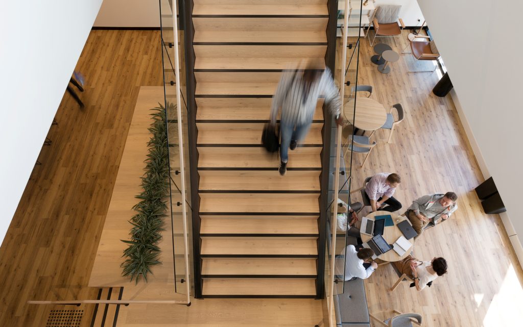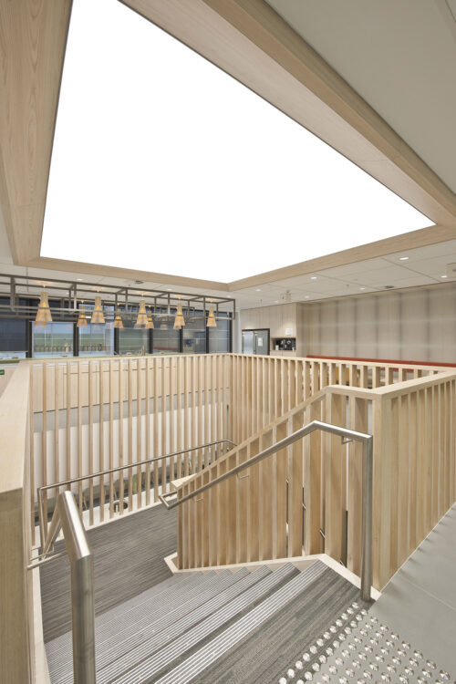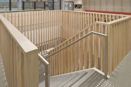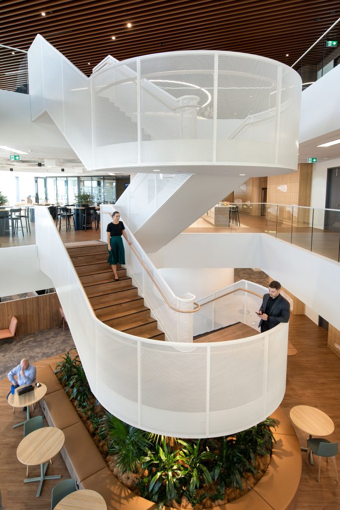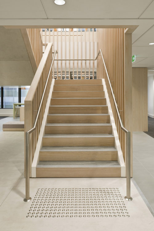 Running through to the upper floor, the interconnecting stair links the hub spaces on each floor to provide flexibility and facilitate both collaborative and individual work. Active Metal also completed all of the timberwork, lime finishing, cement board, carpet to the treads, nosings and tactile indicators to ensure the stair was finished to perfection.