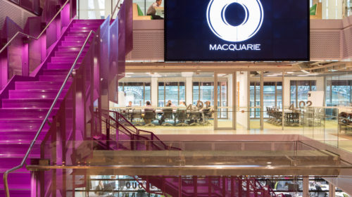 Macquarie Bank has always differentiated itself by focusing on new opportunities. The “Innovation Hub” at 1MP was designed to foster collaboration and knowledge sharing, challenging office norms with a forward thinking design that brings staff, clients and partners together. Central to the workplace design is the creation of highly flexible, team-based working environments which promote collaboration, linked by a central atrium and inter-connecting staircase.