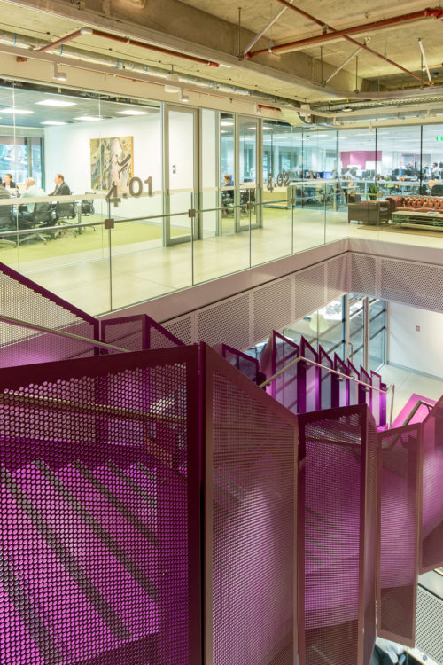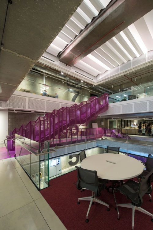 Set across seven levels and over 13,000 square meters, the Innovation Hub steel staircase is not only functional, but also a key design feature of the fit out. Bold in both colour and style, the structural steel stairs, fabricated and installed by Active Metal, were chosen to energise and encourage teams to think outside the square. The jagged, semi-transparent, mesh balustrades, finished in a radien purple colour, to mach the stair finishes, provides a continuous ribbon of colour that leads you through the entire 7 floors.