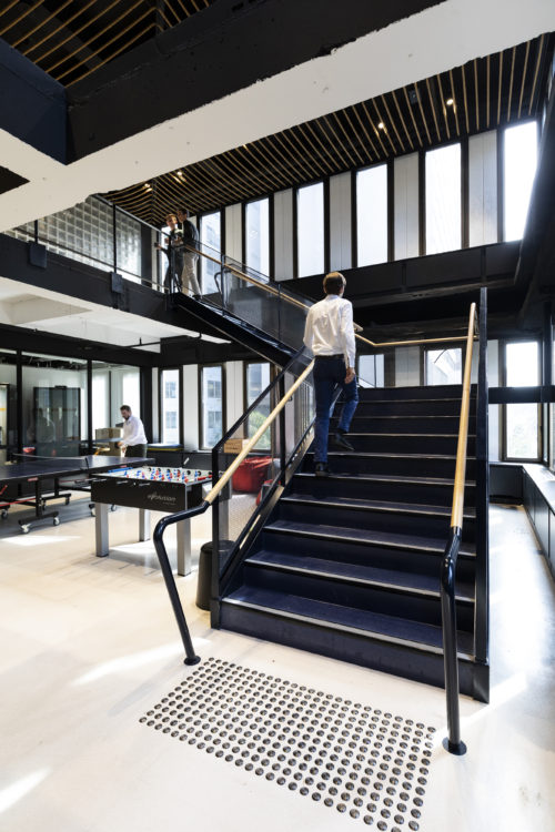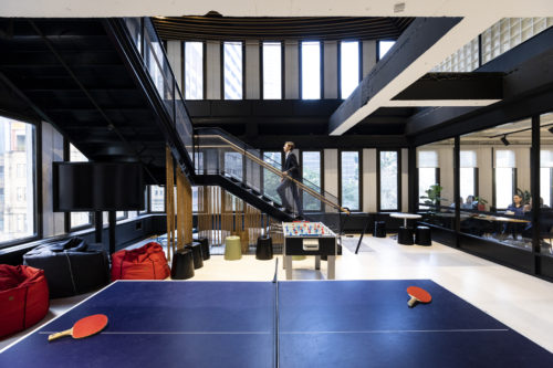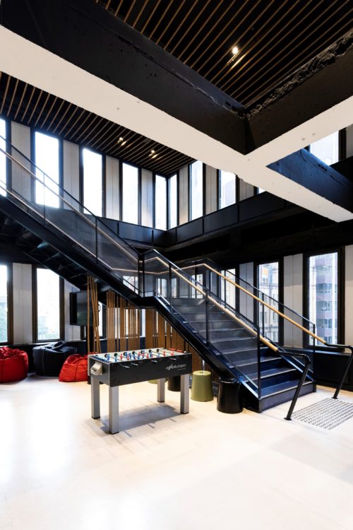 This state of the art space, designed by Group GSA and built by Hunter Mason, is as unique as the company with moody monochrome wall paneling, dark timber stairs and quirky break rooms with ping pong and foosball tables on one floor to subway-like hallways, school-esque office spaces and mismatched vintage armchairs scattered on the floors above.