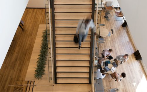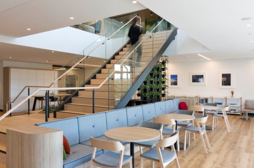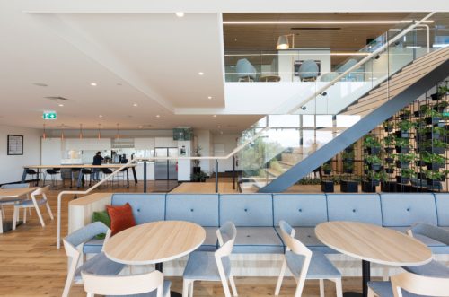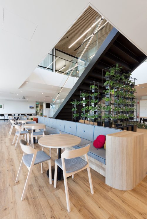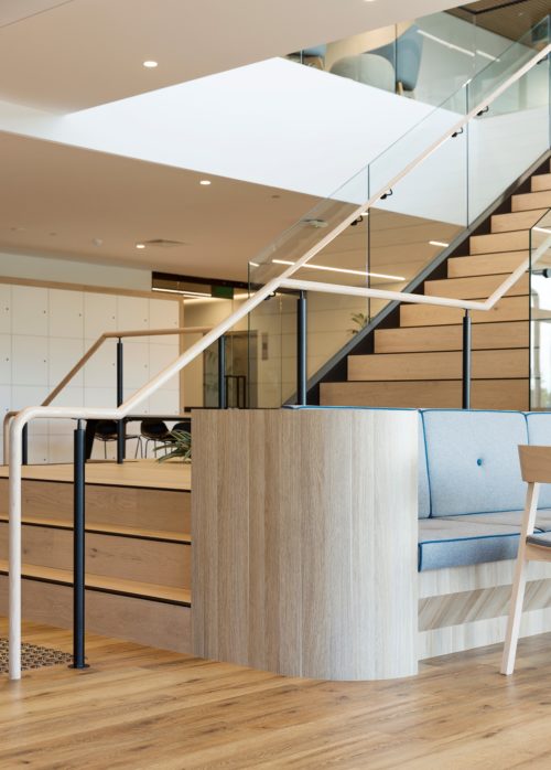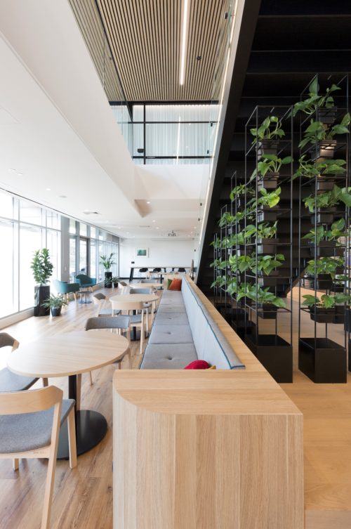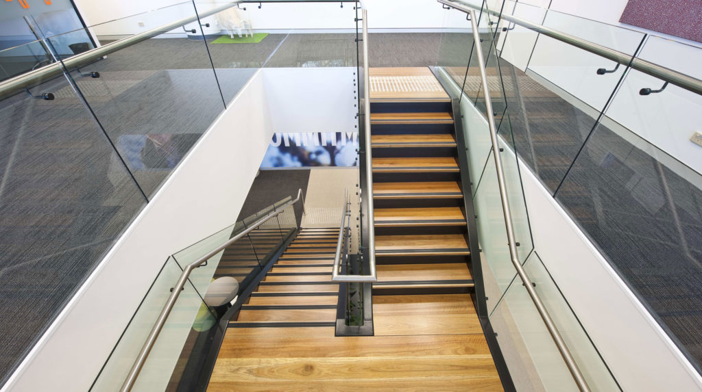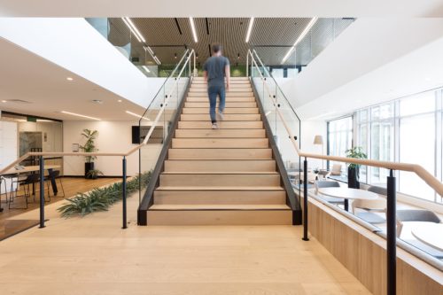 With the office set across two levels, the Active Metal team was brought in to create a central staircase to connect the two floors. Delivered a design that not only blended the natural colour palette and wood elements of the surrounding spaces, but also allowed for the creation of a vertical garden on the underside of the stair.